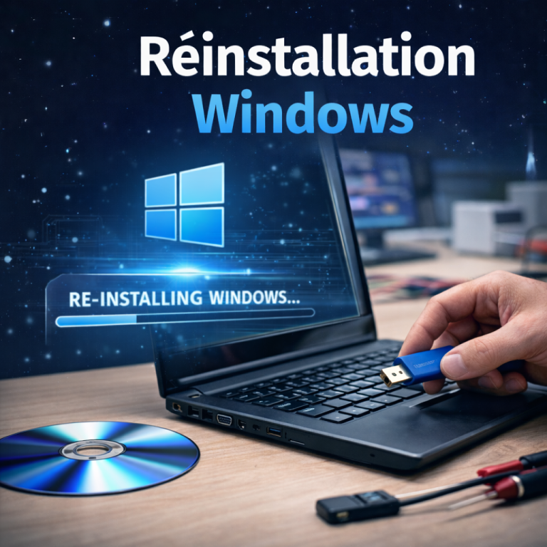 Réinstallation du système Windows avec configuration initiale pour une remise en fonctionnement optimale.